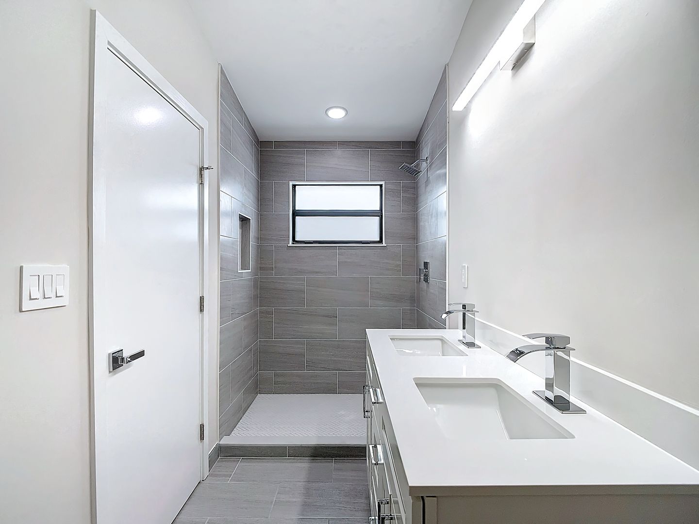 Natural light fills the open, airy interior. The kitchen boasts white soft-close cabinetry, quartz countertops, and stainless steel appliances. The spacious primary suite offers a large closet, double quartz-topped vanity, and custom shower. Generously sized guest bedrooms provide comfortable accommodations.
