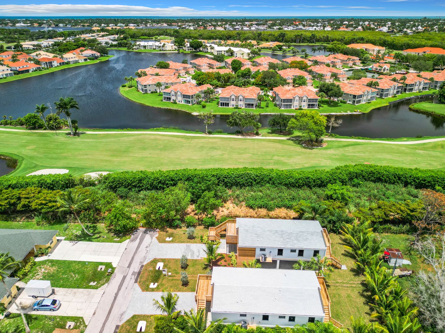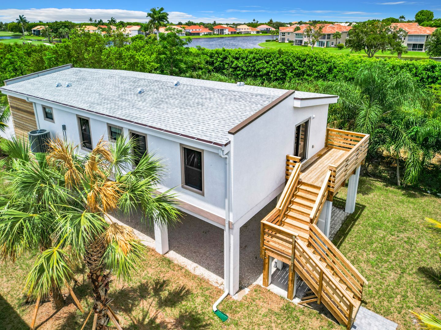 The expansive outdoor deck is perfect for relaxation and entertaining, with ample space for a pool. Below, 1,554 square feet of covered garage space easily accommodates boats, jet skis, kayaks, and vehicles.