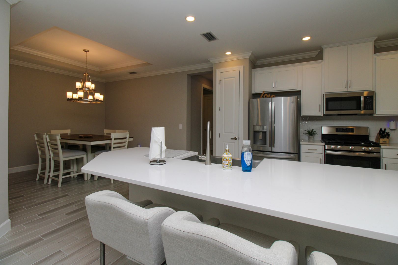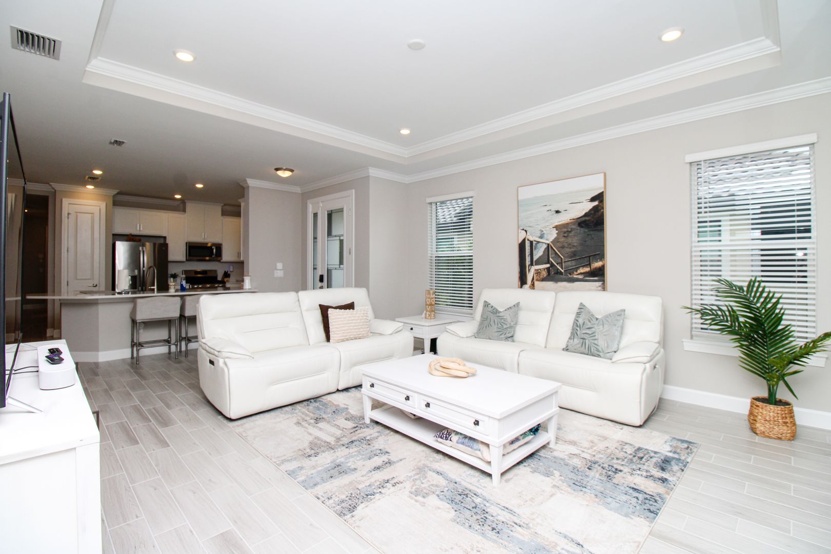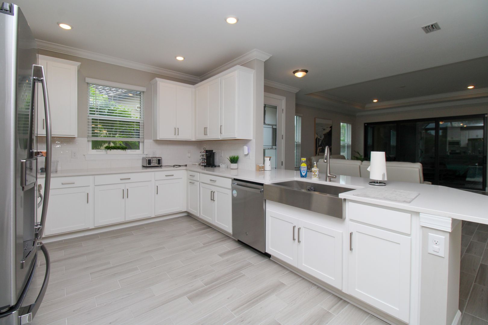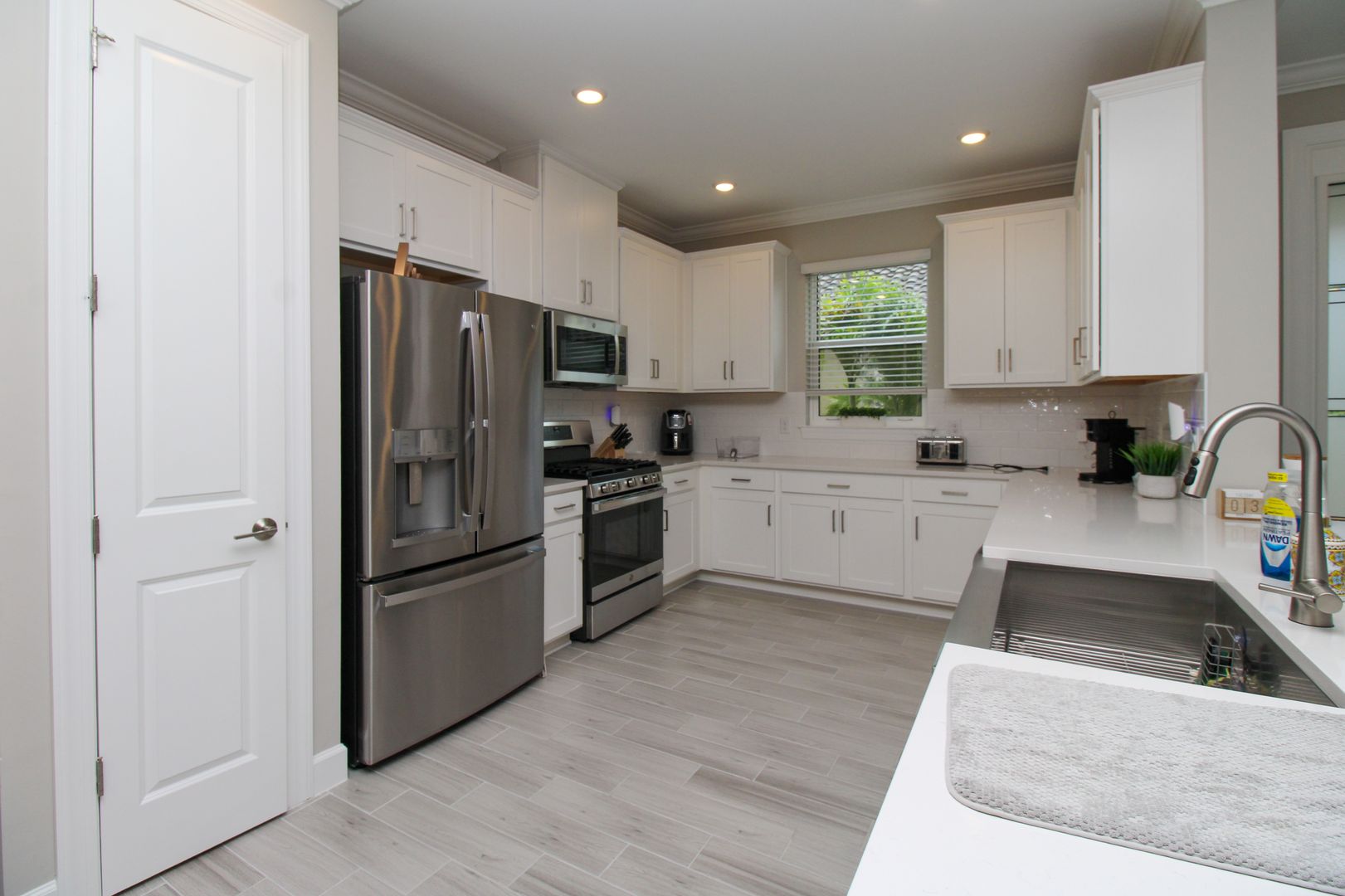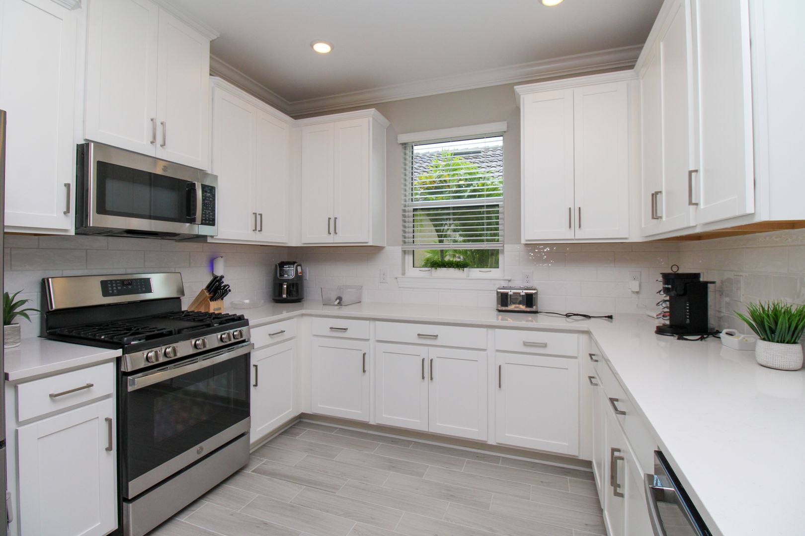 Inside, you’ll find thoughtful upgrades including impact-resistant windows and doors, quartz countertops, stainless steel kitchen appliances, shaker-style cabinetry, walk-in closets, and elegant tray ceilings.