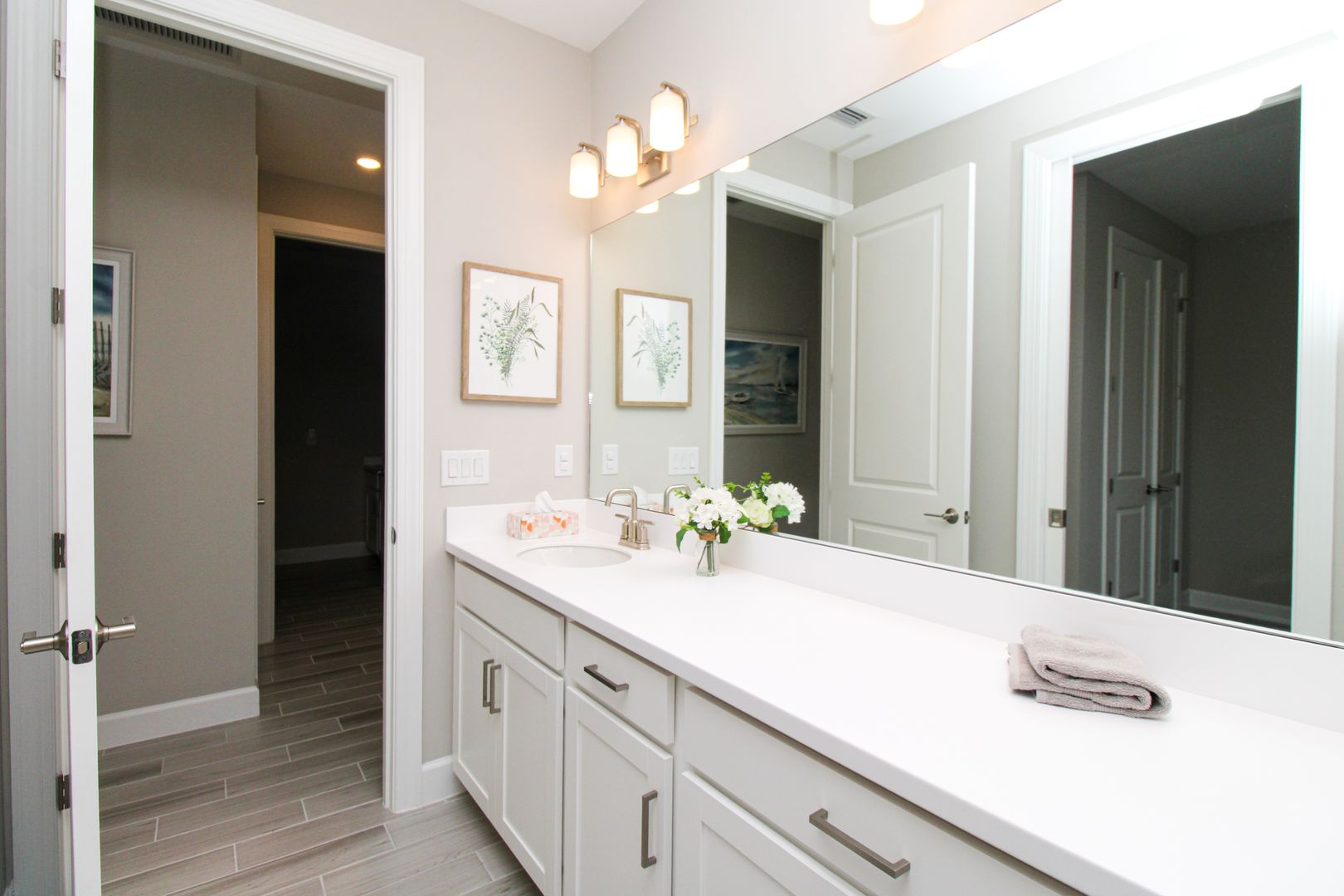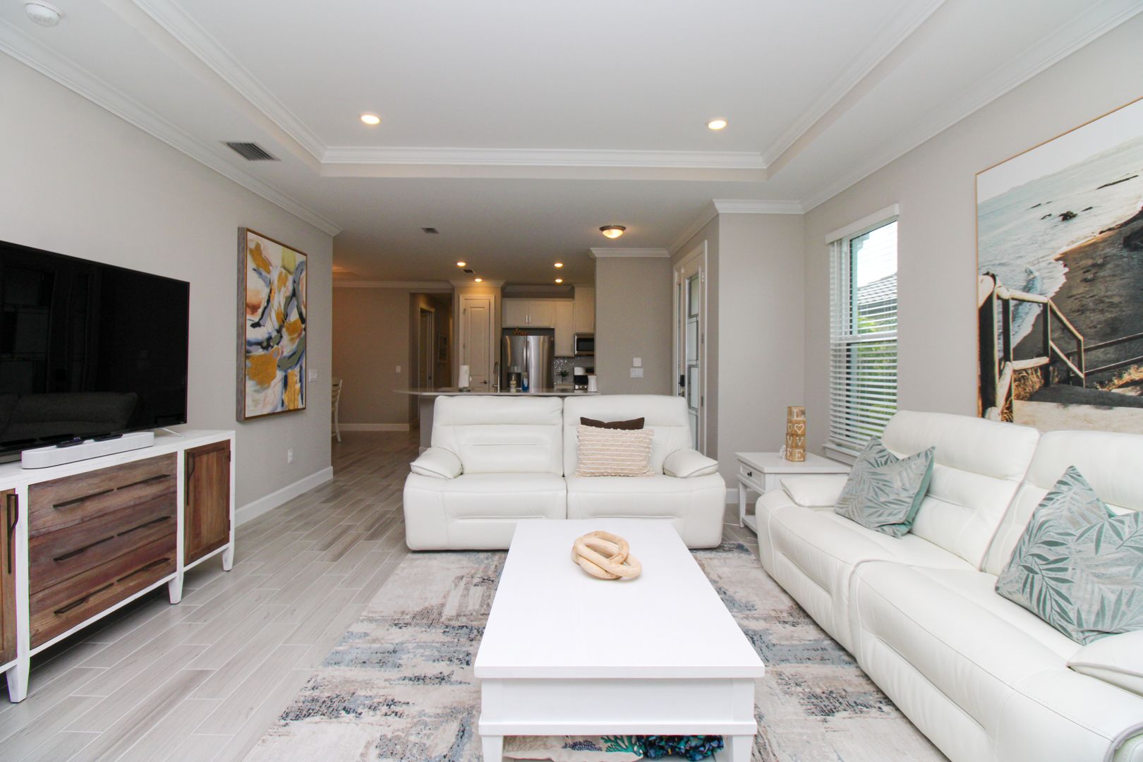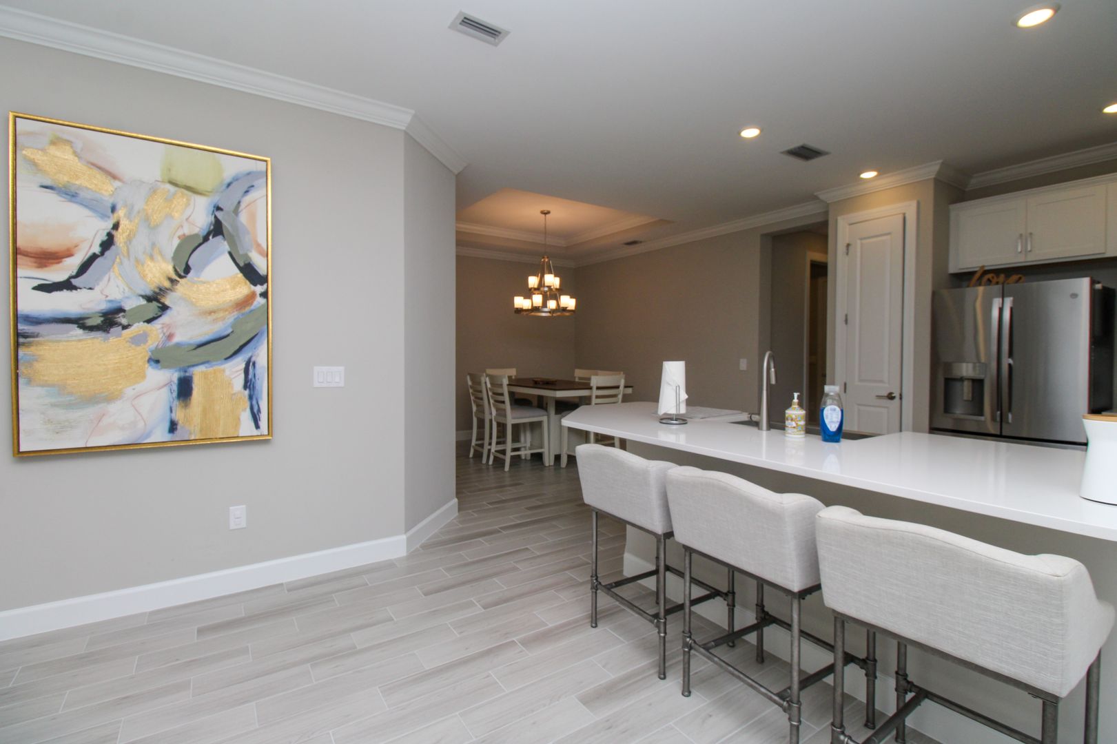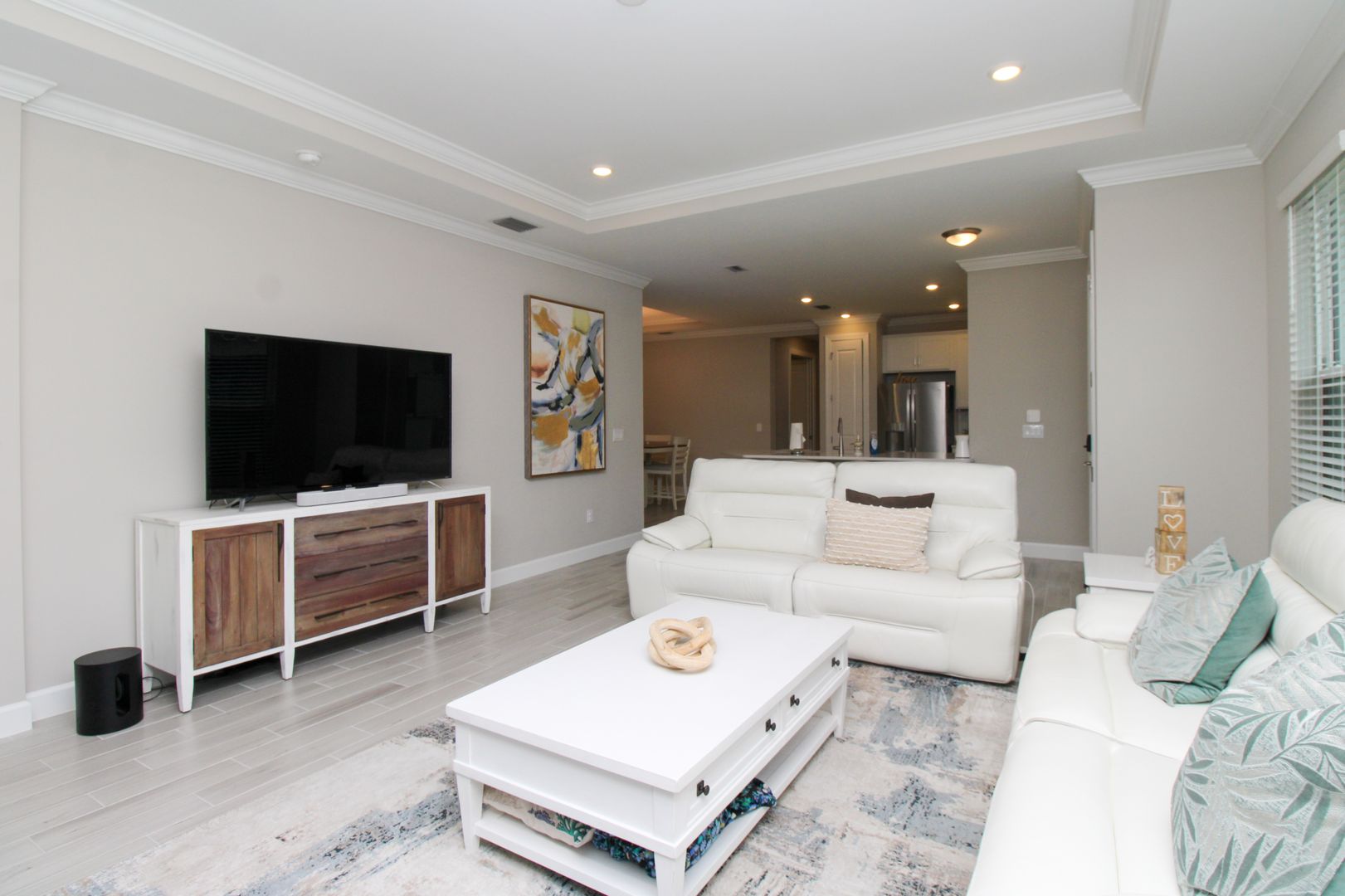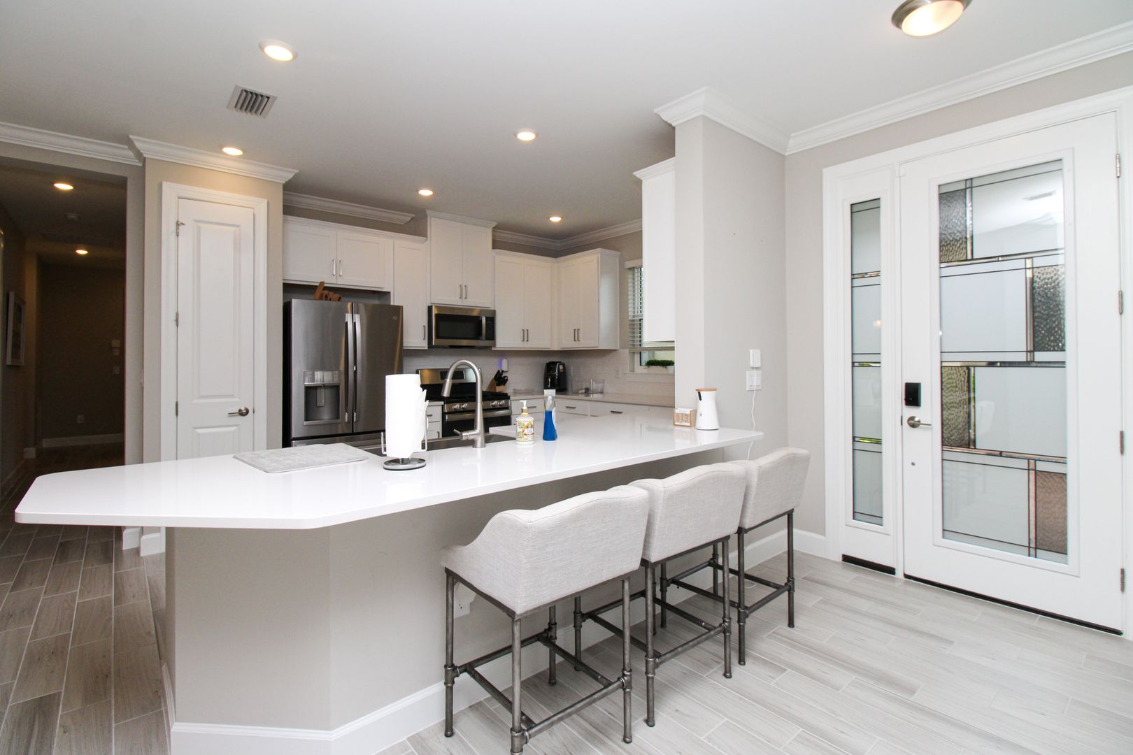 Inside, you’ll find thoughtful upgrades including impact-resistant windows and doors, quartz countertops, stainless steel kitchen appliances, shaker-style cabinetry, walk-in closets, and elegant tray ceilings.