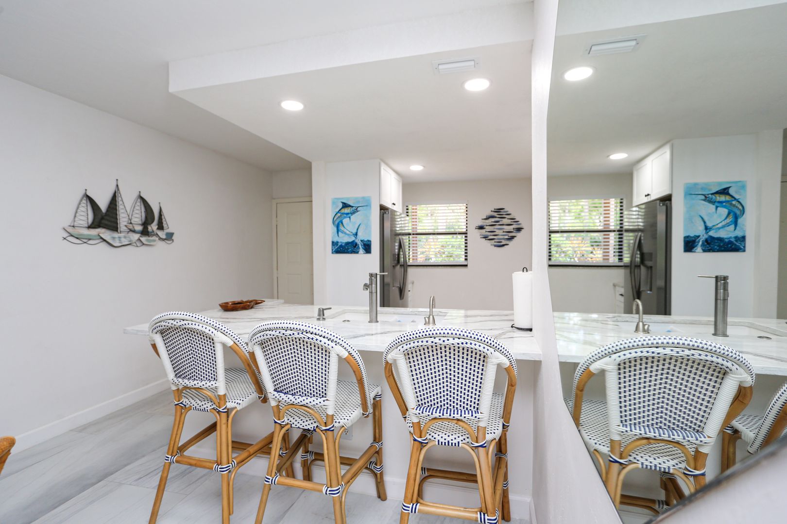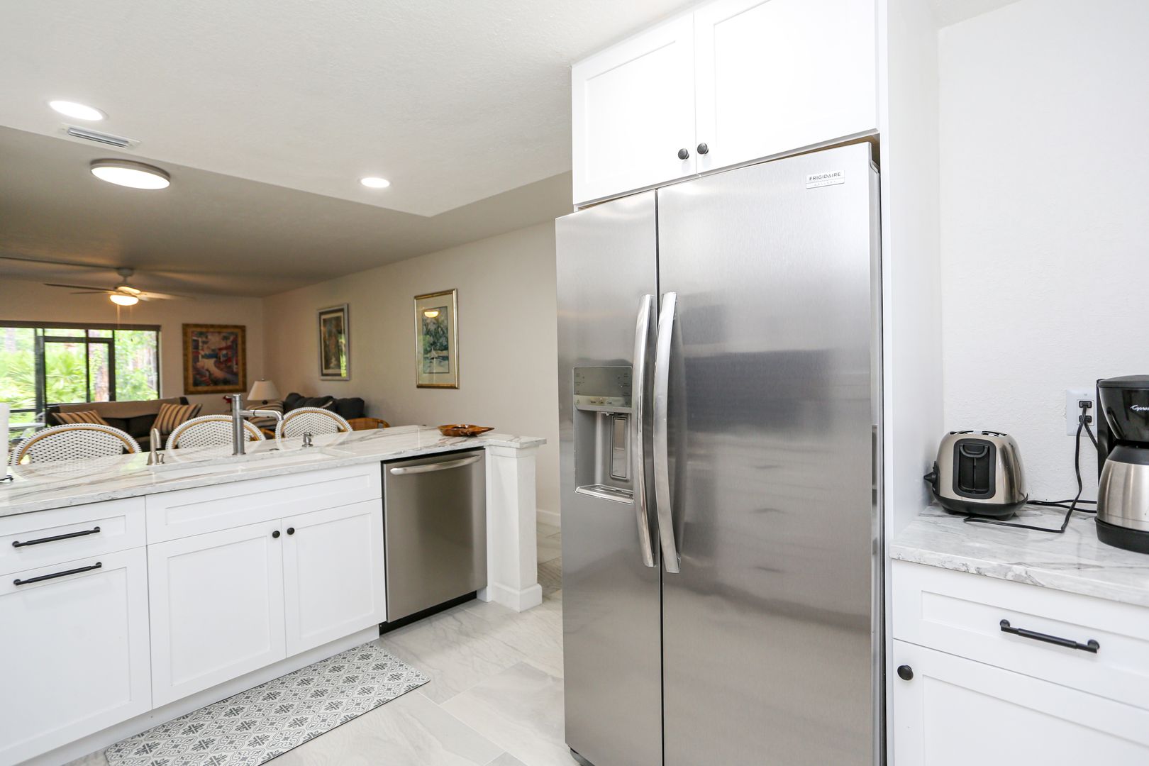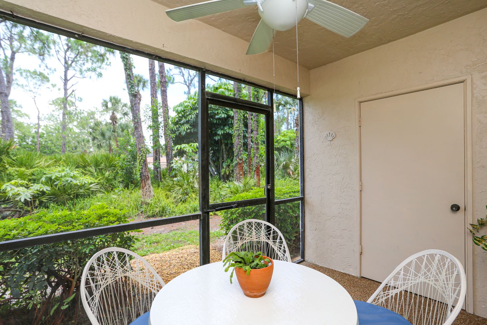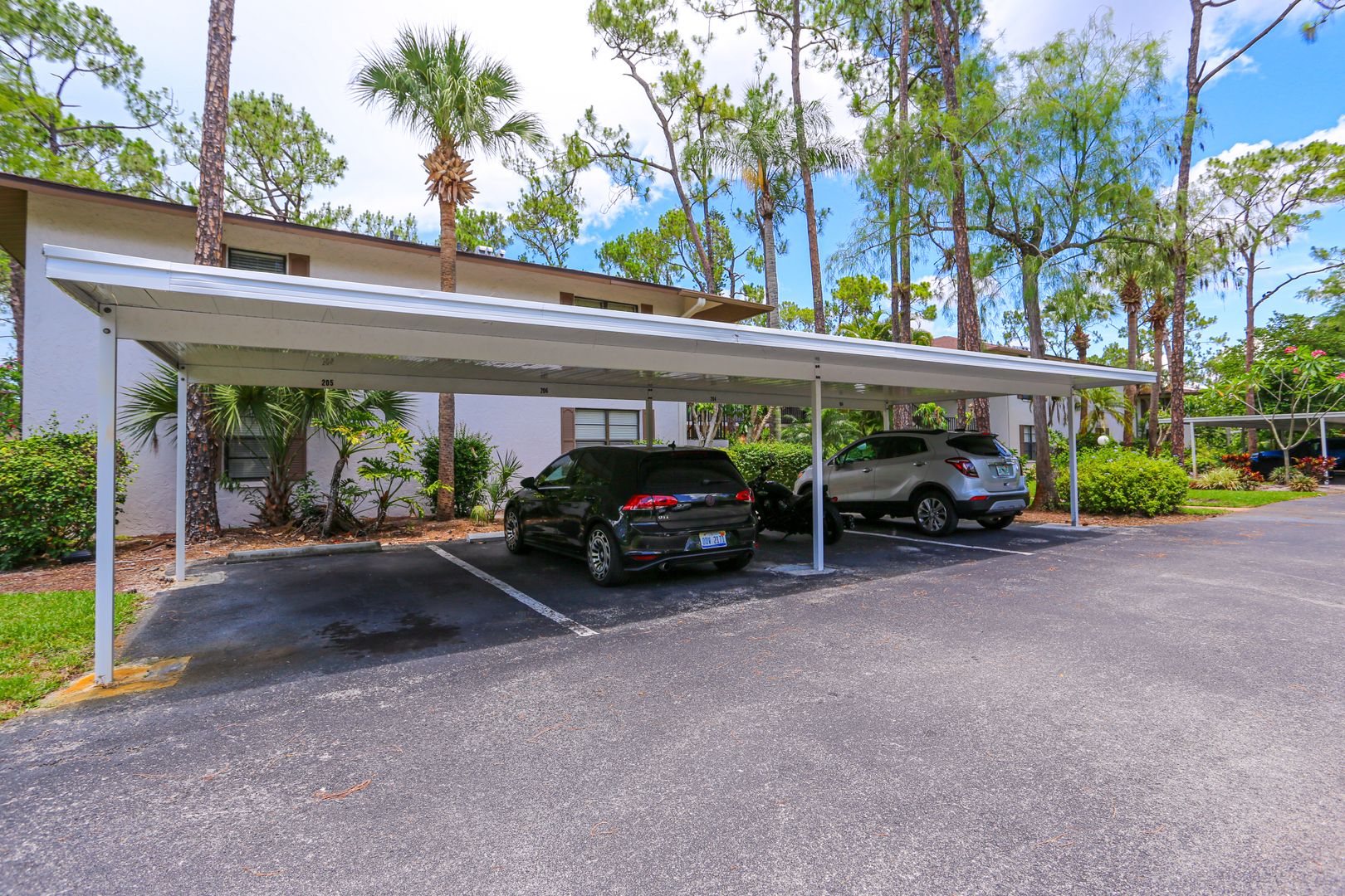 Feel secluded without being secluded. This freshly updated 2 bed 2 bath first floor condo awaits your arrival. Enjoy a spacious kitchen with new cabinets and large marble slab countertops. Access to screened in Lani can be had from the living room glass sliding doors as well as from the master bedroom glass sliding doors. The community pool is a short walk guided by shade from the trees. One car port is available with an overflow parking lot.