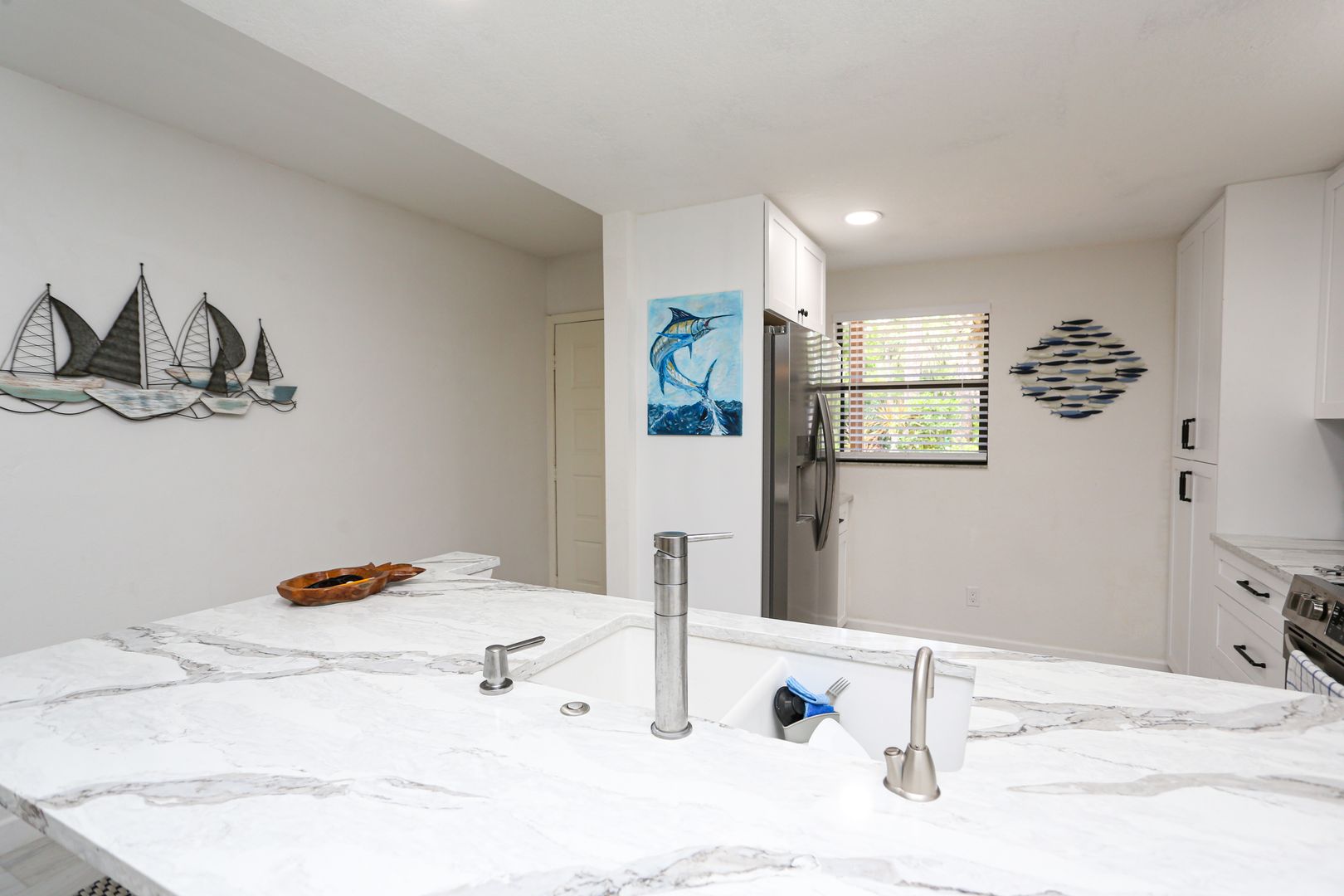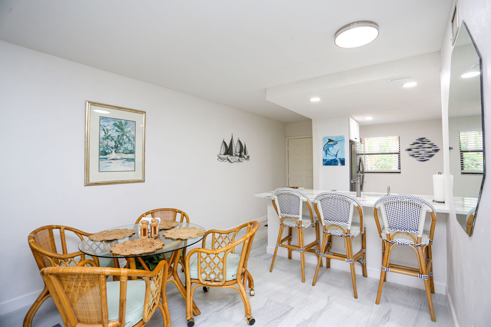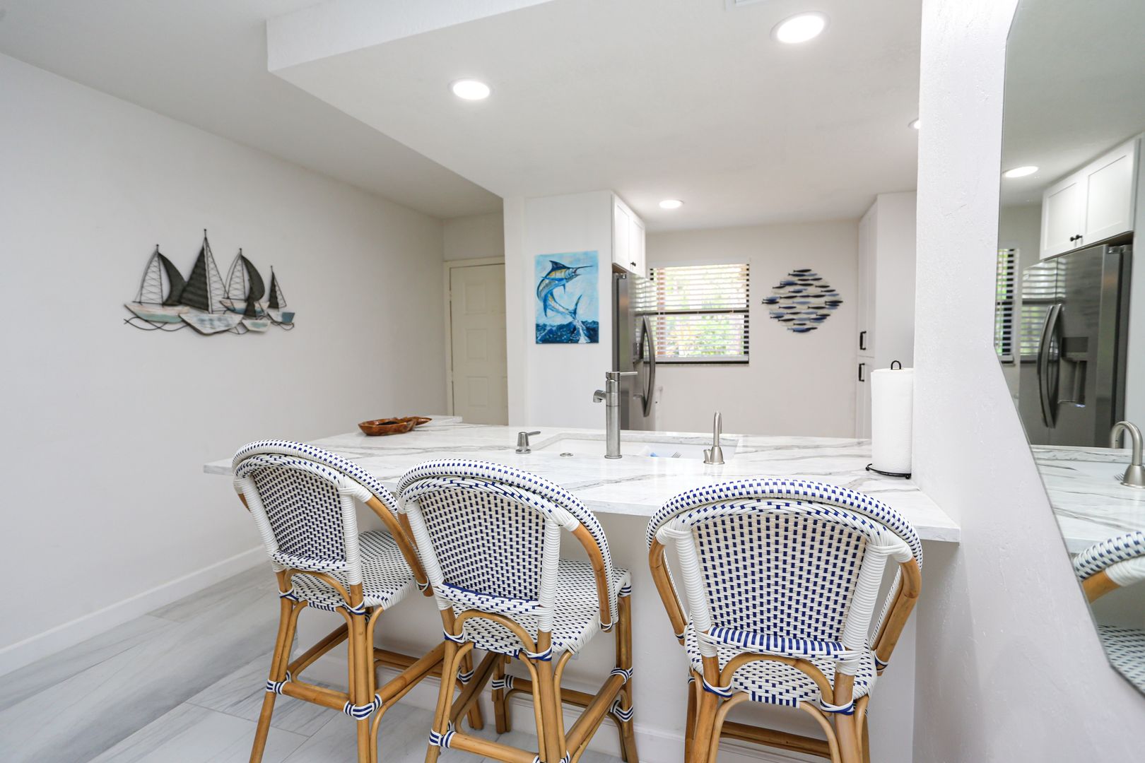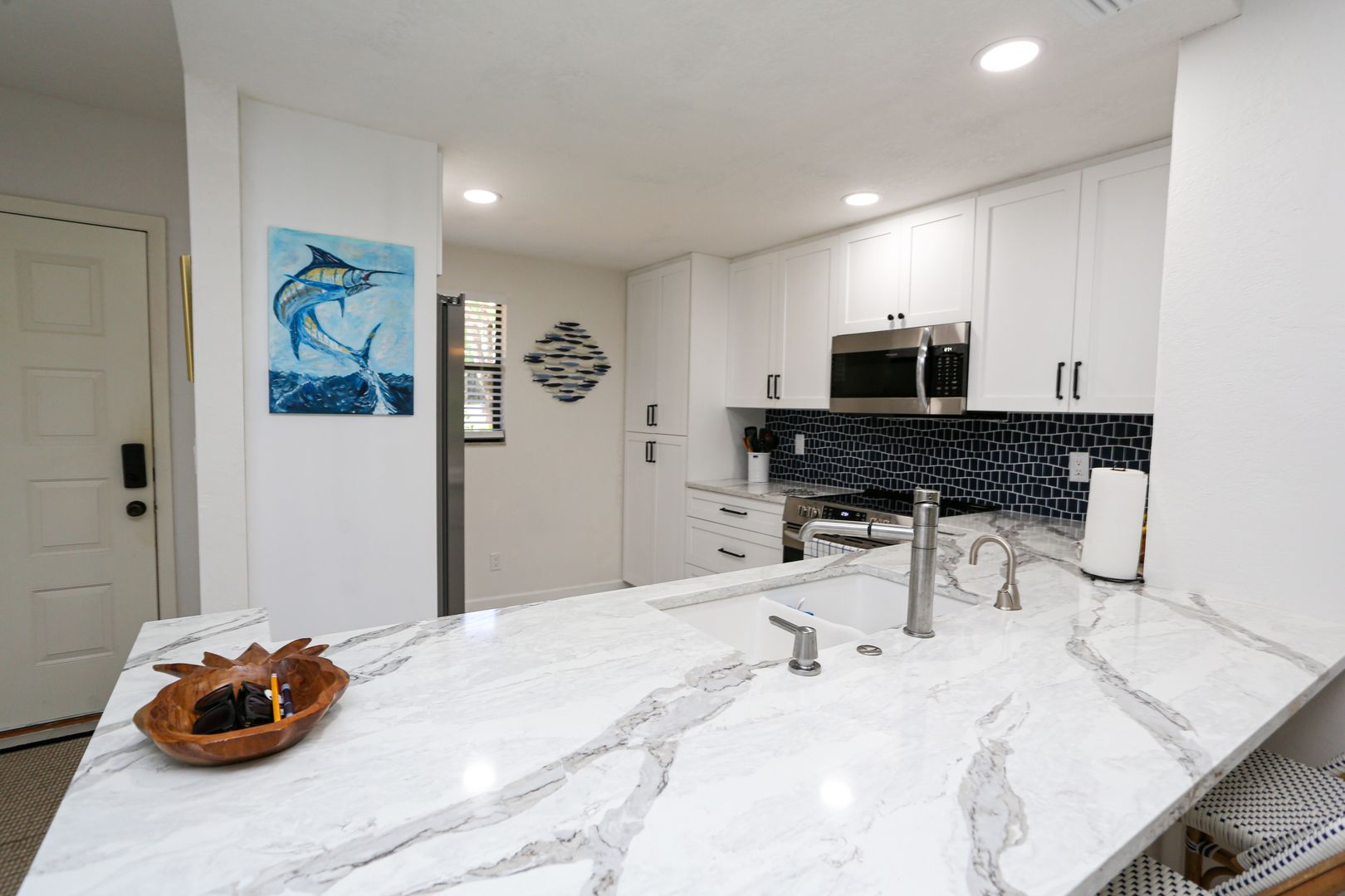 Feel secluded without being secluded. This freshly updated 2 bed 2 bath first floor condo awaits your arrival. Enjoy a spacious kitchen with new cabinets and large marble slab countertops. Access to screened in Lani can be had from the living room glass sliding doors as well as from the master bedroom glass sliding doors. The community pool is a short walk guided by shade from the trees. One car port is available with an overflow parking lot.
